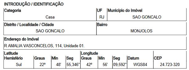 Localização: Casa em Endereço: RUA AMALIA VASCONCELOS ANTIGA RUA F | Bairro: MONJOLOS | Número: N. 114 CS 01 LT13 QD 07 SAO GONCALO - RJ